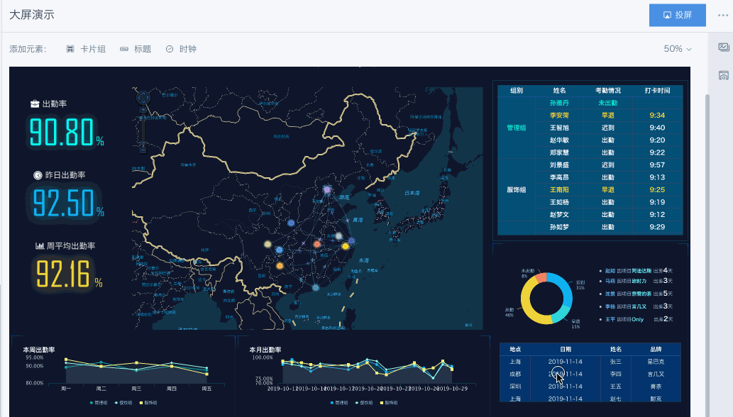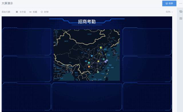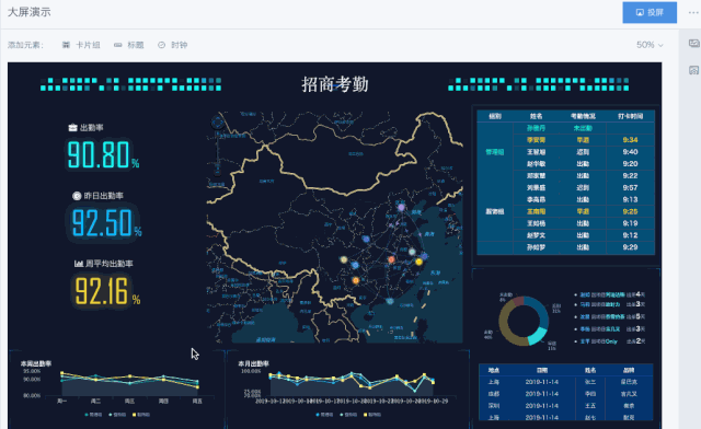 数据大屏只会展示我们想让他展示的东西,所以,在搭建大屏之前,首先要根据应用场景的物理空间,规划每一屏的分析主题。例如一块“招商考勤大屏”可以分为出勤率(月、周、日)、缺勤率、请假分析、加班分析等细分主题,而这些主题分析可能早就存在于我们的BI平台卡片池中。