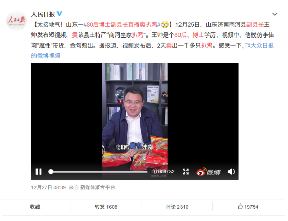 A5创业网(公众号:iadmin5)近日,山东济南这位80后副县长火了,32秒卖扒鸡视频火遍网络,半天卖出半年量。