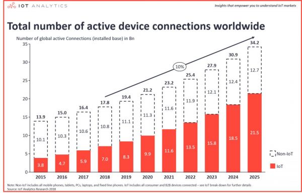 2020年是5G普及之年,更是智能物联网的爆发之年。据知名物联网调研机构IoT Analytics预测,今年的全球活跃物联网设备数将达到100亿台,2020年左右会超过200亿台。