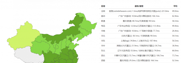 中国全网多线路多地区平均延迟49ms,非常出色。