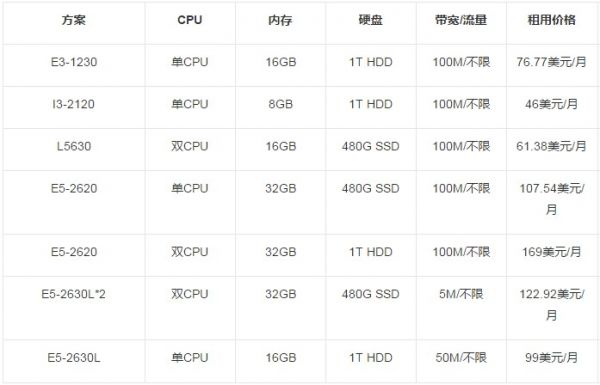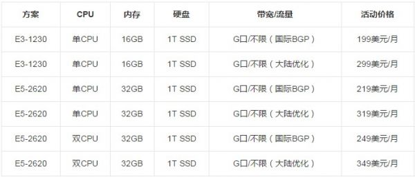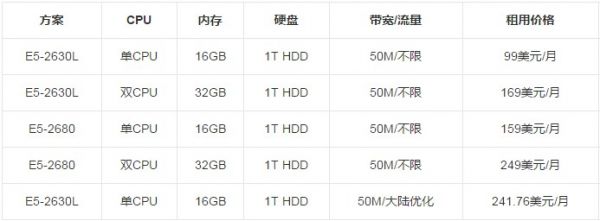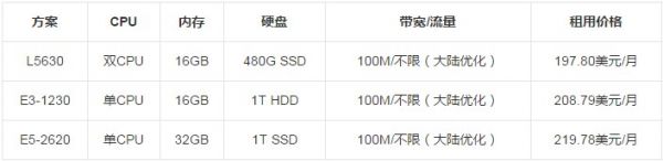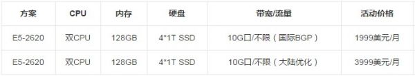 E5-2630L*2方案是香港机房,E5-2630L方案是日本机房,均提供3个独立IP;其他方案默认提供1个10G DDOS IP,大陆优化和国际BGP默认100M带宽/不限流量,精品网线路默认30M带宽/不限流量。
