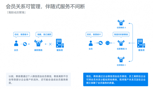 基于企业微信实现数字化内部管理,并结合企业微信连接微信的能力,实现对C端消费者的高效连接,沉淀和分析会员数据以提供优质个性化服务;同时结合微信生态的能力,对接微信支付功能打通线上支付,帮助健身行业全面升级管理和服务模式。通过接入企业微信,可以实现对内优化办公及管理效率,对外提升顾客消费体验,进而真正通过数字化升级实现更好的私域运营。