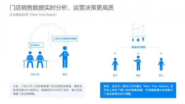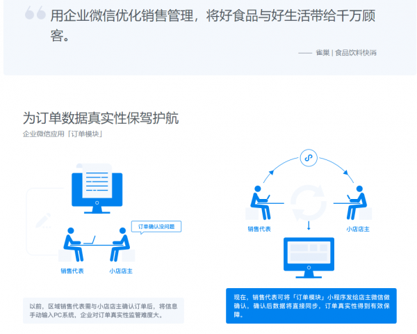 首先是员工沟通协作。通过企业微信将员工进行分组,总店管理人员就可以清楚的了解到各连锁店的管理、营业、人员情况(尤其是大客户的拜访),并且进行及时反馈,极大地减低了管理成本。