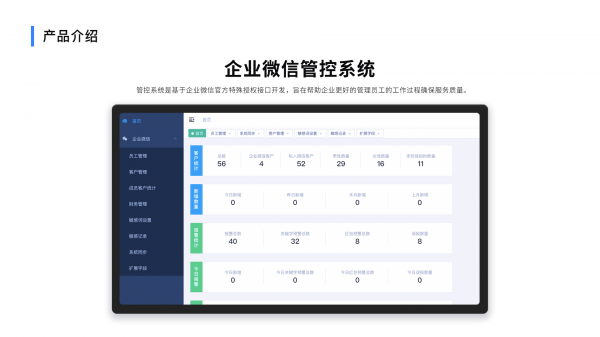 一部分将企业微信自带的数据模块整理,UI界面优化,并根据所需生成精准的数据报表,数据包含:员工客户数量、客户增量排行、重复好友、与客户对话消息条数、响应客户时间、聊天占比等多维度数据,亦可按客户需求定制数据统计报表。