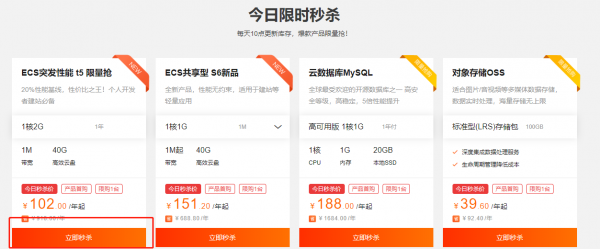 2.然后,在下面今日限时秒杀专区里边就有这款102元的阿里云服务器,点击立即秒杀。