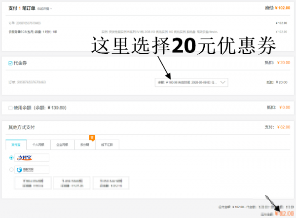 如果你在配置确认页面看见如下图片中的优惠券了,请选择“无”,这里的优惠券非第一步中领到的券。