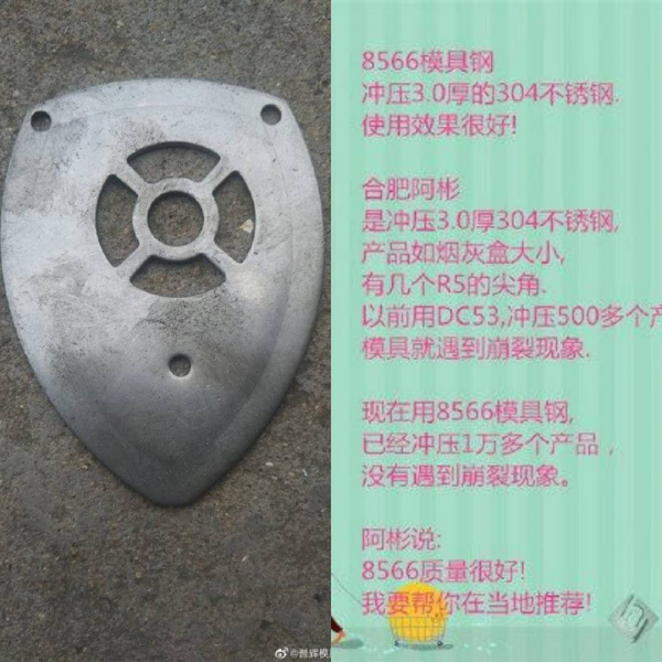 有朋友在百度上,看到8566模具钢冲压不锈钢效果很好,冲头料不会断裂。