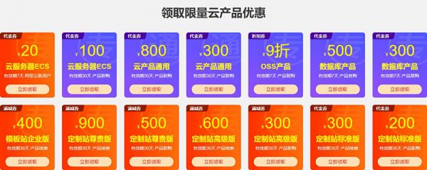 阿里云小站内可领取的云服务器ECS优惠有:20元代金券,100元代金券,300元云产品通用代金券,800元云产品通用代金券,以及各种云产品和建站的优惠券。(领取入口可在文末获取)