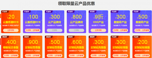 2.建站产品满减券:模板站企业版、定制站尊贵版、定制站高级版、定制站标准版专用满减券。