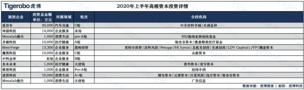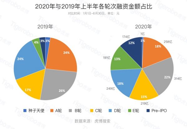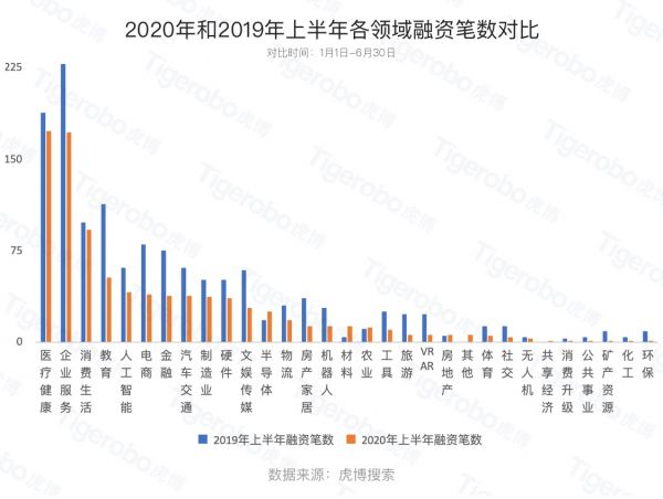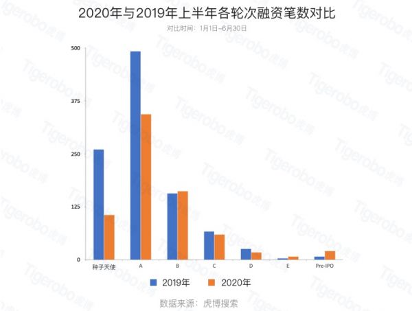 本次盘点内容,数据来自虎博搜索,选取2020年1月1日至2020年6月30日及2019年1月1日至2019年6月30日的公开市场数据,且仅计算已披露金额的投融资事件;轮次主要以种子天使、A、B、C、D、E、Pre-IPO计算,其中Pre-A、A+轮均计入A轮,以此类推;投资金额以人民币计,单位“元”,美元、港币汇率分别以7、0.9换算;凡以“过亿/数亿”、“过千万/数千万”、“过百万/数百万”等形式披露的投融资金额,记为“1亿”、“1000万”、“100万”,单位“元”。