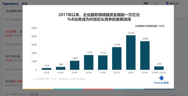 虎博搜索数据显示,企业服务领域的融资总次数占比由2019年上半年的22%提升到了今年同期的24%。此外,在虎博搜索中查询到的公开研报显示,2017年至2020年3月15日,企业服务领域融资金额已超一万亿元,企业服务业务成为科技巨头竞争的重要战场。