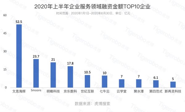 企业服务领域最大额一笔投资来自国资企业中国电子收购文思海辉,金额达52.5亿元。排名第二来自雾化科技解决方案提供商Smoore的23.7亿元Pre-IPO融资。明略科技E轮21亿元融资排名第三,由腾讯领投。