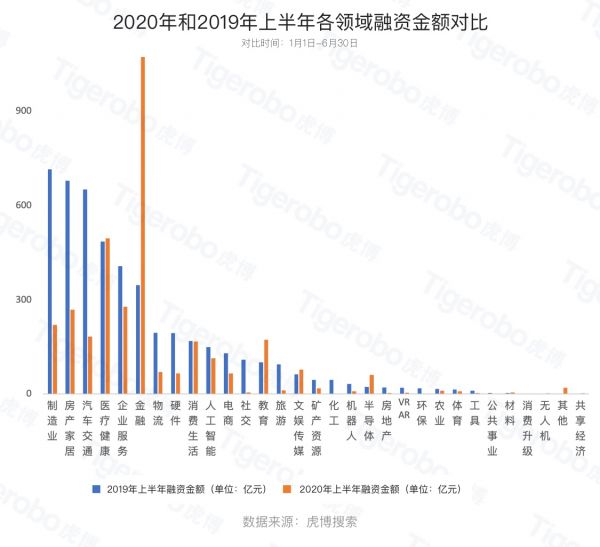除去这一特殊事件的影响,医疗健康、企业服务是2020年上半年最吸金的两个领域。不过虽然两个领域融资笔数相当,但由于缺少大额融资,企业服务融资总额与医疗健康还是有较大差距。另外,房产家居、制造业、汽车交通3个领域融资总金额虽然同比大幅下滑,但仍跻身前五。