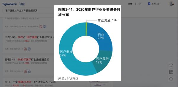 德勤相关报告显示,伴随COVID-19疫情期间AI的大规模应用,巨头布局与政策的鼓励,AI医疗热度仍处于医疗行业细分领域中较高水平。其具体细分领域分布则为57%医疗器械,25%药品、17%医疗服务以及1%商业流通。