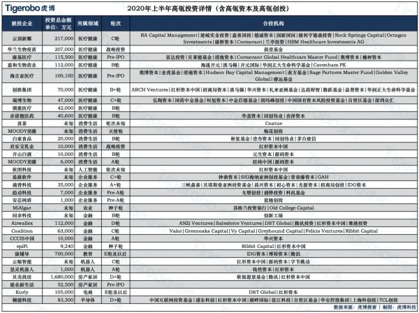 相比红杉资本中国和腾讯,排名第三的高瓴投资侧重略有不同,但也印证了今年上半年的市场偏好,其排名前三的投资领域分别是医疗健康9次、消费生活6次、金融5次。高瓴参与了上半年医疗领域融资额排名二三的云顶新耀、华兰生物疫苗的投资。消费生活领域参与的最大一笔投资来自白家食品2亿元B轮融资。