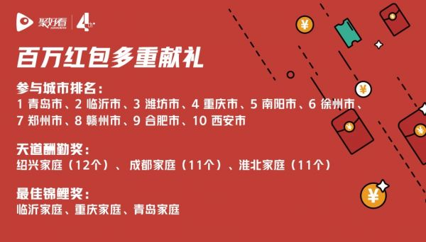 活跃就有大锦鲤。在城市榜单中,北方城市“完胜”南方城市,抢到“超级大红包”的家庭,也大多位于北方。截止到目前,获得聚好看“最佳锦鲤”称号的三个家庭分别来自临沂、重庆、青岛,北方城市占了两席。