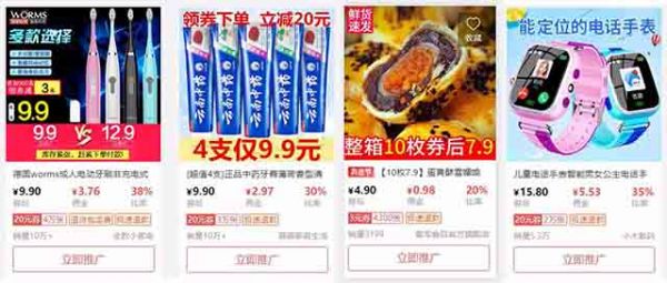 比如9.9包邮的高品质电动牙刷,9.9四支的云南白药牙膏,7.9一箱的蛋黄酥,15.8的电话手表。