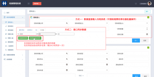 支持接口批量同步历史与增量的待归档材料;也支持卷票机、扫描仪等仪器批量采集线下档案。