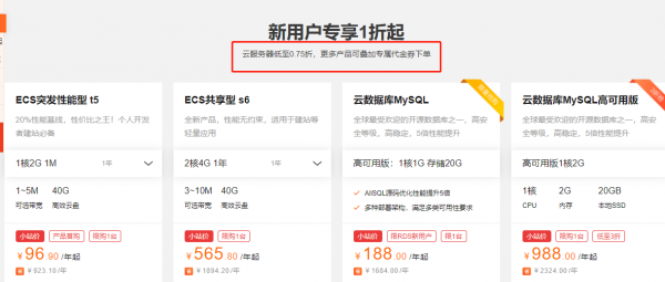新用户1折起专区所推出的云服务器配置和价格均来源于阿里云当下正在进行中的热门促销活动中所推出的爆款云服务器配置,同时还包含了一些其他热门云产品,例如云数据库MySQL、国内通用短信套餐包、SSL证书、云解析DNS等。另外,虽然我们领取了代金券,但是阿里云很多促销活动是不能使用代金券的,而如果我们通过云小站新用户1折起专区购买,部分产品是可以叠加专属代金券下单的,因此,如果你还没购买过阿里云产品,可以通过云小站注册阿里云账号,并领取代金券之后,再通过新用户1折起专区购买阿里云服务器,并在购买过程中使用代金券进步一减少购买成本。