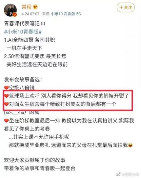 不过最大的问题还是因为品牌屌丝化带来的营销低俗化,比如印象比较深的adiaos的T恤,刘诗诗的十核双茎头,最近还有小米10青春版的50倍变焦拍男生裤裆、女生宿舍什么的,这些都是官方出来的宣传方式,容易引发狂欢,但对品牌的伤害确实是无可挽回的。