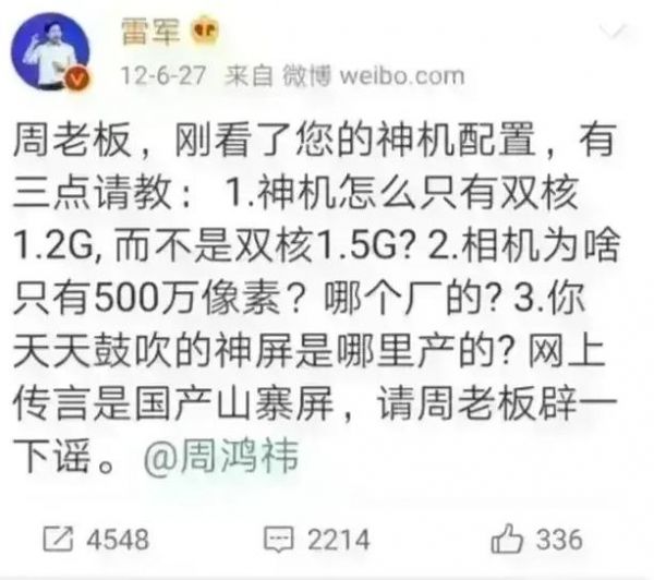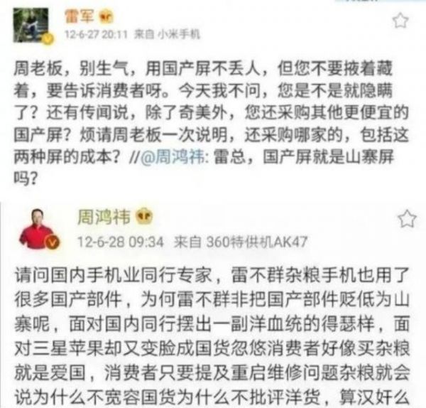 不过演讲中有一点我觉得比较困惑,就是雷总表示说是当年要带动国产产业链的进步。但我印象中,雷总还专门因为老周卖的特供机用了国产屏而冷嘲热讽说是山寨。当然,从这个老截图中,大家可以看出,谁当时要批评小米手机的重启问题,是要扣上不宽容国货的帽子。