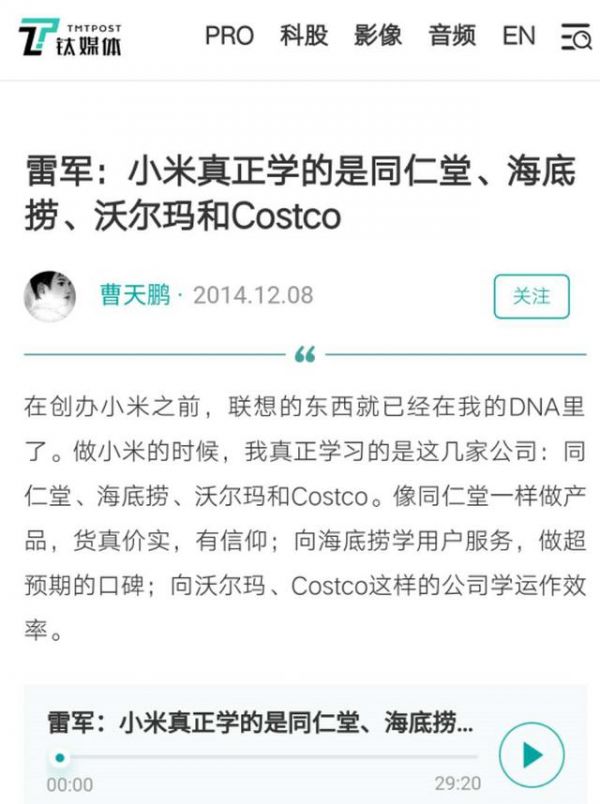 2011年,我刚开始写博客文章,主要领域是电商和互联网,其原因是因为做投资,这方面的接触比较多,行业也比较接近。雷总的演讲虽然是从三顾茅庐找人开始,但小米的开始准确的说应该是从在黄章办公室喝了六个月的可乐,然后拿着“学”到的资料开始的。不承认黄章这个老师,我觉得不太厚道,之间的公案,我也不赘述。