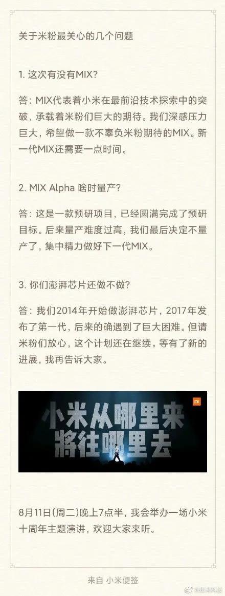 就在雷总十周年演讲的预热中,听到了几个不太好的消息,一个是小米吹了一整年的“Mix Alpha”我们不做了,一个是下一代Mix还没好,一个是澎湃芯片没有进展。基本上值得期待的都没有进展。
