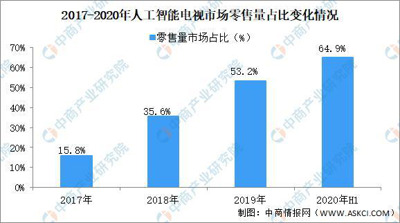 自乐视以生态玩法进入电视行业以来,智能电视行业经历了快速发展,且成为我国电视行业的主流。来自中商产业研究院的一份报告显示, 2019年智能电视零售量占电视市场的半壁江山,2020年上半年占比提升至64.9%。