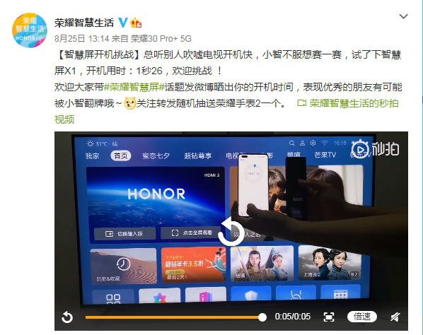 荣耀是这场战役的吹号人之一。日前,荣耀在微博上发起了智慧屏开机挑战活动,在强调自身的开机时间“1秒26”的同时,邀请用户晒出家中的智能电视开机时间。