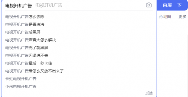 因此,许多消费者深受其苦。在百度搜索框中输入“电视开机广告”,跳出的关联词条是“电视开机广告怎么去除”、“电视开机广告是否违法”等,可以想见用户对于智能电视开机广告的厌烦。