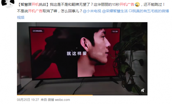 但与部分厂商所宣扬的不同,从用户反馈来看,低价电视开机广告的现象似乎并没有好转。8月25日,一位参与荣耀智慧屏开机挑战活动的小米电视用户就反馈称,仍然存在15秒开机广告,且不能跳过。