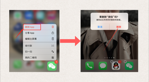 具体方法: 长按微信点击软件上方的x删除APP,或是打开手机设置,点击上面的苹果账户进去,点icoud,iphone存储空间,找到微信的图标点进去后直接删除微信应用,也可以达到删除微信聊天记录的效果。