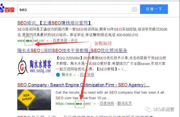 百度白皮书中曾经提到过“域名”和“title”这两项在网页评分中都是10,其他的因素都是10以下的。也就是说在一个网页的优化排名中,这两项因素是最重要的!下面我们百度搜索“SEO”我们可以看到百度都会在域名中进行标注加粗,这也同样说明了百度对此的重要性!
