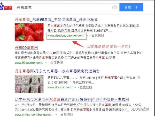 我家是丹东的,17年的时候,帮朋友做了一个“丹东草莓”的站点,域名被我注册了“dandongcaomei.com”是关键字的全拼,我跟他说优化方法,更新!结果不到两个月的时间突然就跳到了百度前三名,后来稳定在第一名很长时间,后来朋友转行了,这个站点被另外一个同学买去了,放哪里也不进行优化,文章都不更新了,所以排名统一下降的很厉害!不过就算不更新,排名下降,也一直保持在“10-20多名”之间浮动,偶尔也会跳到首页!这个排名案例主要就是用了“全拼域名”的效果!