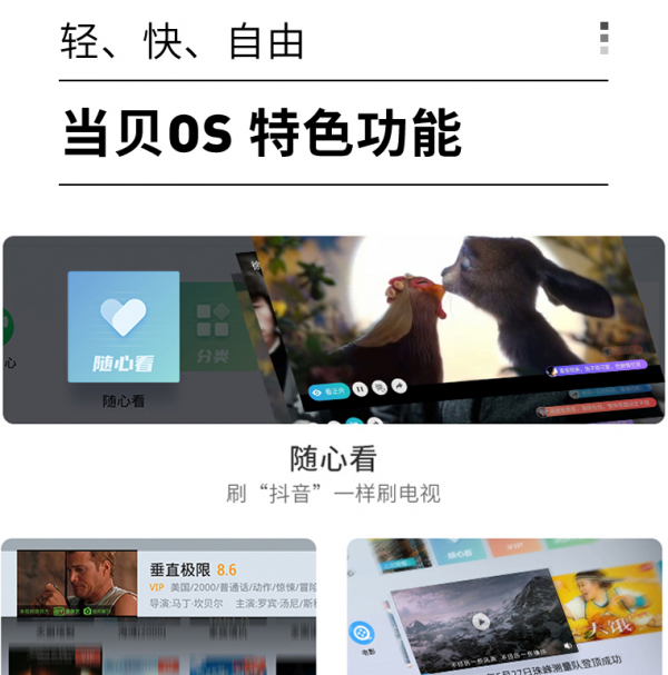 当贝OS作为当贝投影杀手锏式的存在,为投影仪的使用带来一次又一次惊喜。例如像刷“抖音”一样的“随心看”功能,既能解决剧荒,又能不看广告,深受用户喜爱不是没有理由的。除此之外,还有可自定义的桌面,独家定制的球迷板块以及精彩预览等等。集成了爱奇艺、腾讯、芒果TV、优酷等多家视频平台超700万小时的全量资源,尽享私人大屏影院。当贝独家的找回遥控器功能,让你再也不用担心遥控器又去哪儿了的问题。还有画中画、魔法同屏、高清动态壁纸等功能等你体验!