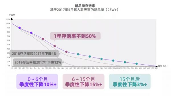如果你是2018年入驻的新品牌,那1年存活率还要再降4%,如果不幸赶在“爆发元年”2019年入驻,那真是一将功成万骨枯,1年存活率也就30%的样子。