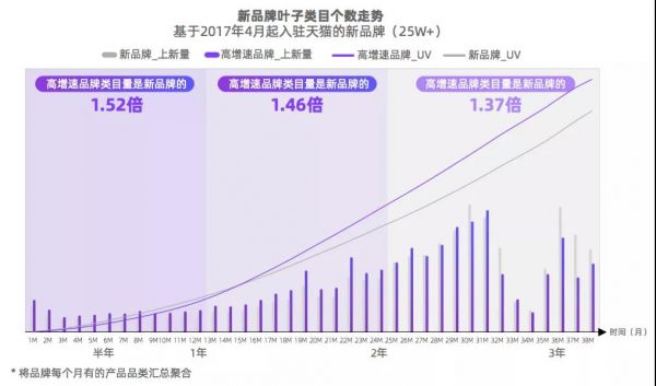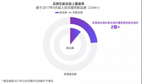 数据显示,高增速品牌往往有敏锐的嗅觉,他们在新品类上的覆盖率是同期入驻品牌的2倍以上。