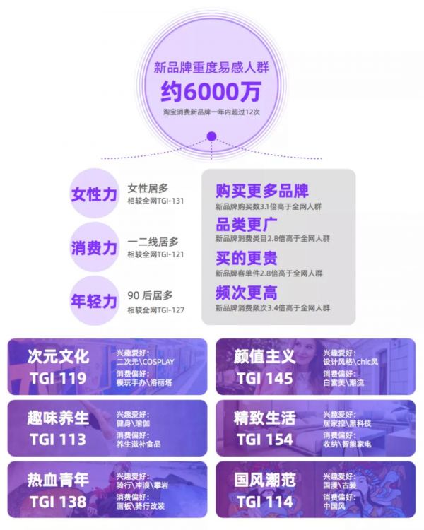 阿里的数据洞察显示,如果把一年内淘宝消费新品牌超过12次的人定义为“新品牌重度易感人群”,这将是个约6000万的庞大人群。他们的典型画像是女性,居住在一二线,90后,覆盖六大年轻圈层,有鲜明的消费特征。