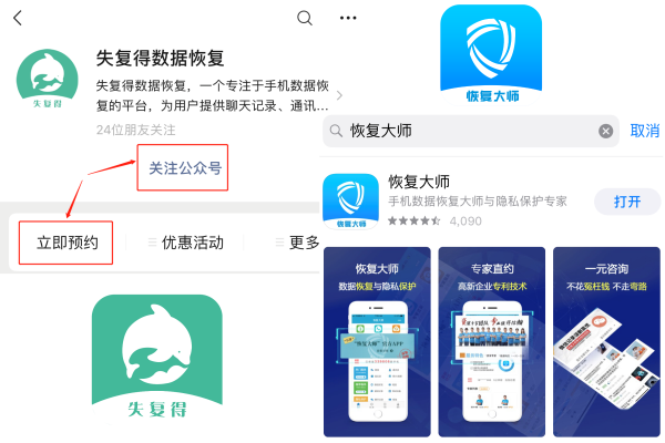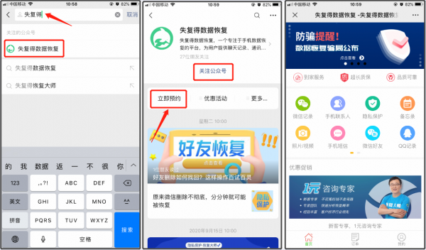 打开微信,搜索“失复得数据恢复”关注该公众号后,点击下方的【立即预约】,然后在首页可以看到有多种选项,点击”微信好友“的类目就可以恢复删除的微信好友了。有问题可以直接添加工程师微信kefu0-04 沟通,或者咨询400-887-1866。