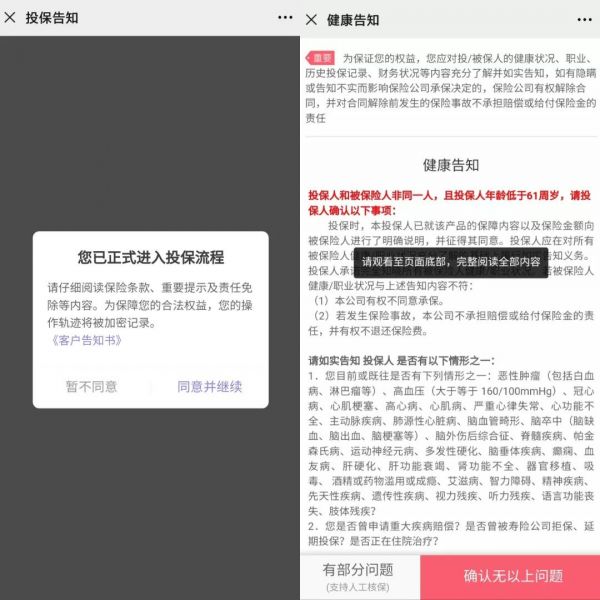 可回溯销售系统上线后,互联网保险平台投保流程将更为严谨。36氪在某互联网保险平台尝试投保,点击投保键后平台出现弹窗,告知用户投保流程将被合法加密记录,随后出现的健康告知则不能跳过,若直接跳过,系统会反复提示需阅读完毕。