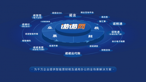 诺诺网创立以来,不断探索企业财务管理的云端化,基于线上化的业务场景创造了丰富、多元的企业服务生态,打造了票据、财税、办公、数科四大业务板块,通过 SAAS 化的企业财税应用,为企业提供全方位多维度的产品和服务。旗下核心产品包含诺诺发票、极速开票、诺通付、诺诺云代账、诺账通(云端记账产品)、诺言、诺慧签(电子合同)、诺税通、诺诺课堂、诺诺云办公等,为企业财务管理工作创造了更多便捷。凭借领先的技术优势、创新的服务模式,目前,诺诺网的服务已覆盖全国,为千万余家企业提供了智能票财税及通用办公的全场景解决方案。