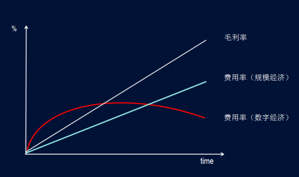 而在数字经济下,前期费用率大于毛利率(电商前期亏损严重),当过了某个时间节点,费用率将快速下降,利润率快速上升,两者差额迅速扩大。