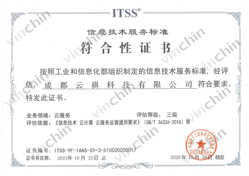 成都云祺科技有限公司获工信部ITSS颁布的《信息技术服务标准符合性证书》,并通过云服务三级认证。