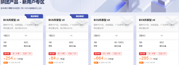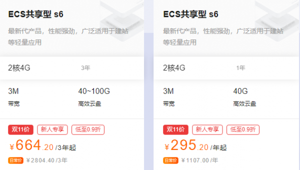 2、共享型s6,2核4G 3M,295.20元/年,3年仅售664.20元(建议购买这个,不浪费新用户的高福利!);