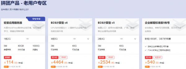 在以往的双十一里,老用户活动总是特别少甚至是没有,以至于很多老用户出现了不少埋怨,此次阿里云为了关照到老用户的感受,特地推出了好几个老用户专属活动,老用户可以参与的活动有拼团会场“拼团产品 - 老用户专区”,云服务器会场“爆款专区”等,专区内所推出的云服务器等双11产品均是新老用户均可以购买。