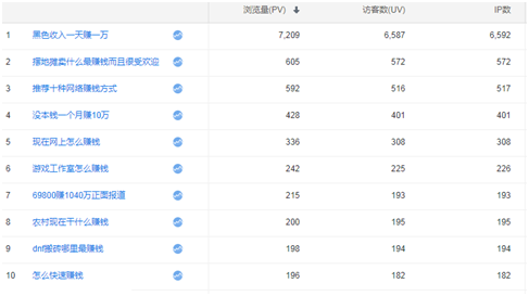 这是我们百度统计的一部分数据,关于“网赚”类的关键词排名数据,可以看到几乎什么关键词都有,当然截屏有限,所以只展现一部分的关键词排名,一个网赚行业,能够在2个月的时间里,一天拿到这么多IP,不吹牛的讲,在行业里面算做的不错的了。那么如何做的呢?