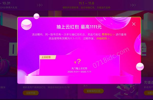11月01日-11月08日: 爆款折扣提前享,逛会场抽红包,充值返代金券