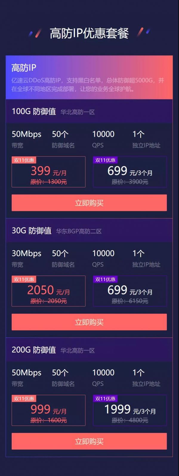 现推出的“100G防御值”高防IP优惠套餐,体验价只要399元/月!!!
