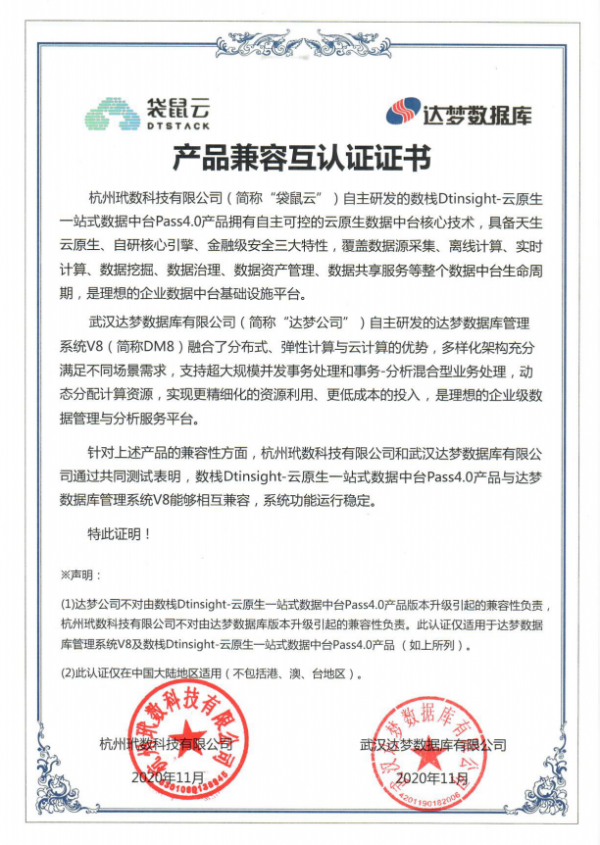 近日,袋鼠云与达梦数据库完成产品兼容性互认证,通过共同测试表明,数栈Dtinsight与DM8能够相互兼容,系统功能运行稳定。