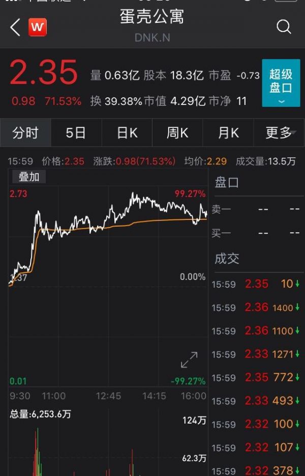 被媒体密集轰炸破产跑路的蛋壳公寓,在周二的美股市场上股价一度暴涨90%!最终收盘涨71%,报2.35美元。当然成交放天量,达到1.43亿美元。在过去的一年内,该股最低成交价为1.27美元,最高成交价为13.9美元。有传言称蛋壳公寓将被我爱我家接盘。